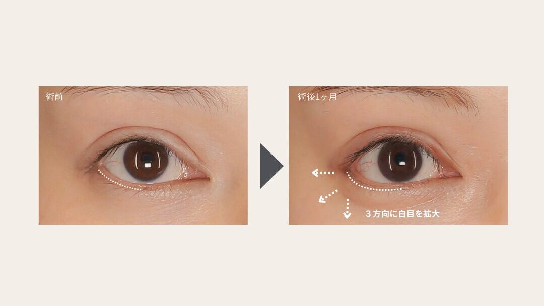 これにより、つり目の改善や白目を大きく見せる効果が期待でき、柔らかく優しい印象の目元に近づけます。