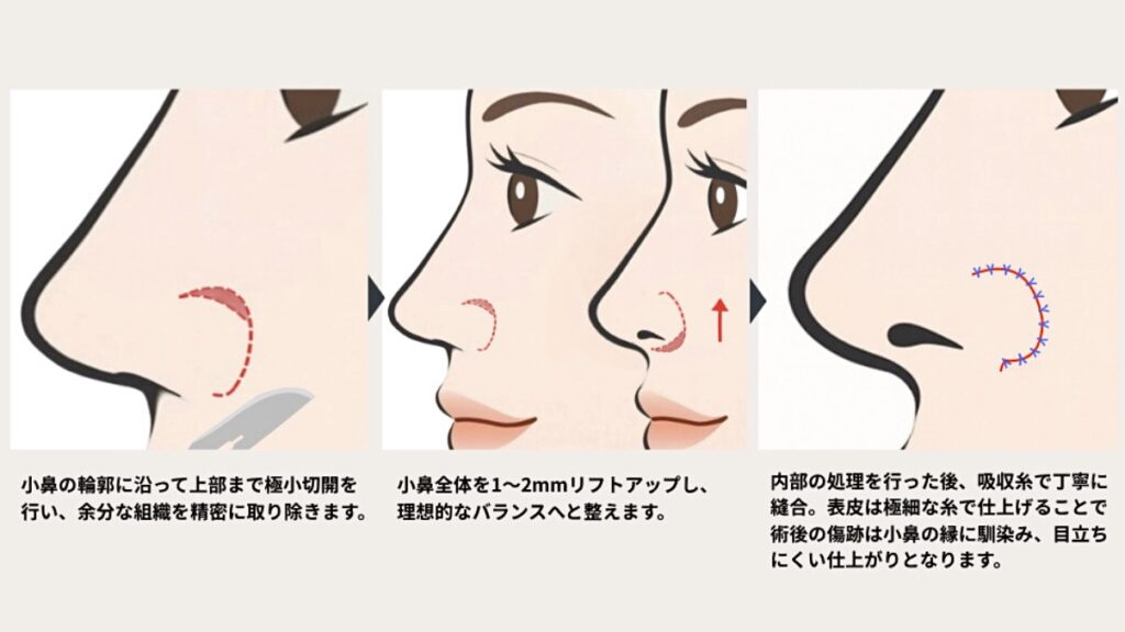 ただ小鼻を上げるだけでなく、鼻尖・鼻柱・鼻翼の関係性を立体的にデザイン。横顔・正面どちらから見ても自然なシルエットに。